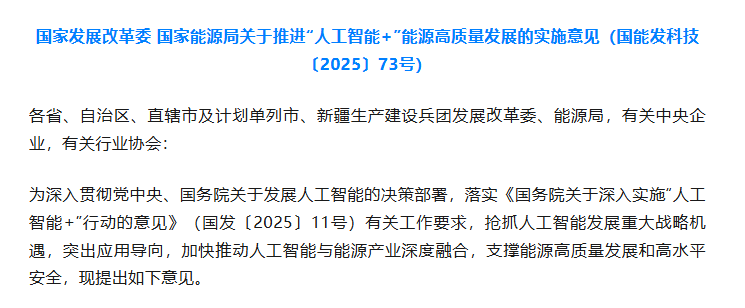 9月8日,国家发展改革委和国家能源局联合印发《关于推进“人工智能+”能源高质量发展的实施意见》(以下简称《实施意见》)。明确提出推动人工智能与能源产业深度融合,为能源高质量发展和高水平安全提供支撑。