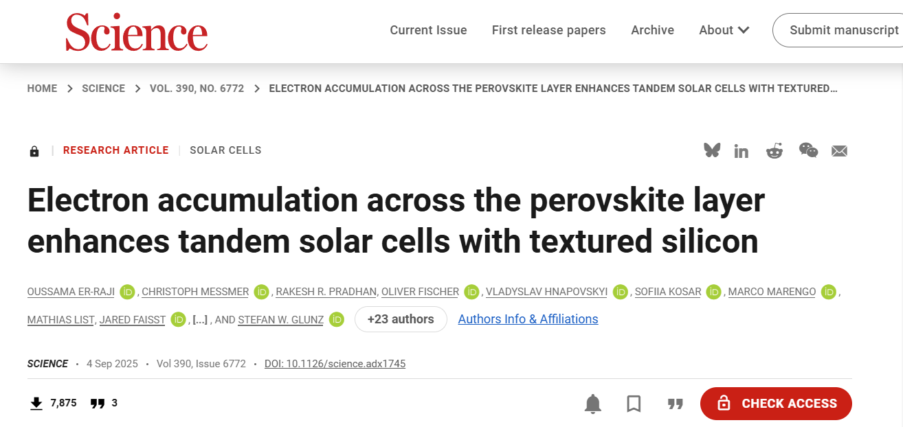 更关键的是,产业化的技术瓶颈正被逐一攻克。发表于《Science》的研究通过表面分子工程,在工业级粗糙硅衬底上实现了33.1% 的效率并稳定运行1500小时。这表明钙钛矿技术不仅能在实验室中表现出色,更具备了产业化应用的实际潜力。