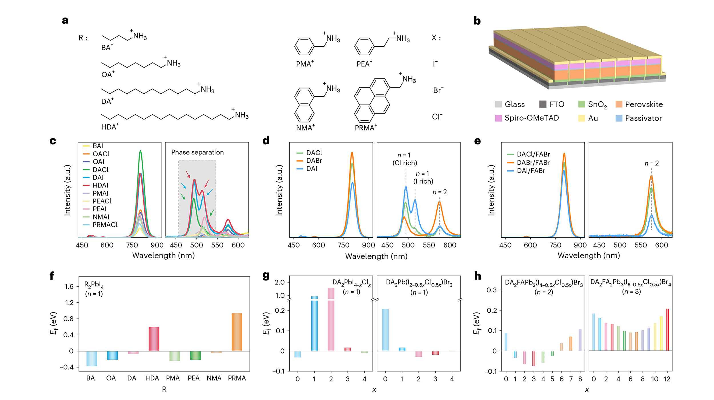 Fig. 1 | Compositional engineering of the 2D perovskite phase for scalable solar modules. a, Chemical structure of 2D ligands (RX) for passivation of perovskite films. RX represents the ammonium halides, in which R and X are organic ammoniums (depicted on the left-hand side) and halides (depicted on the right-hand side), respectively. BA, n-butylammonium; OA, n-octylammonium; DA, dodecylammonium; HDA, hexadecylammonium; PMA, phenmethylammonium; PEA, phenylethylammonium; NMA, 1-naphthylmethylammonium; PRMA, 1-pyrenemethylammonium. b, The schematic diagram of PSM with the structure of glass/FTO/SnO2/perovskite/passivator/spiro-OMeTAD/Au. c–e, PL (left) and local enlarged PL (right) spectra of perovskite films post-treated with different organic RX salts (c), DAX (d) and DAX/FABr (e). The grey box and coloured arrows in c highlight the appearance of n = 1 2D phase separation, which is observed in HDAI (pink arrow), DAI (blue arrow) and DACl (green arrow) samples. The vertical dashed lines indicate the PL peak position. f–h, Calculated formation enthalpies of R2PbI4 (n = 1) (f), DA2PbI4−xClx (n = 1) and DA2Pb(I2−0.5xCl0.5x)Br2 (n = 1) (g), and DA2FAPb2(I4−0.5xCl0.5x)Br3 (n = 2) and DA2FA2Pb3(I6−0.5xCl0.5x)Br4 (n = 3) (h). The y-axis break in g enables intuitive data comparison.