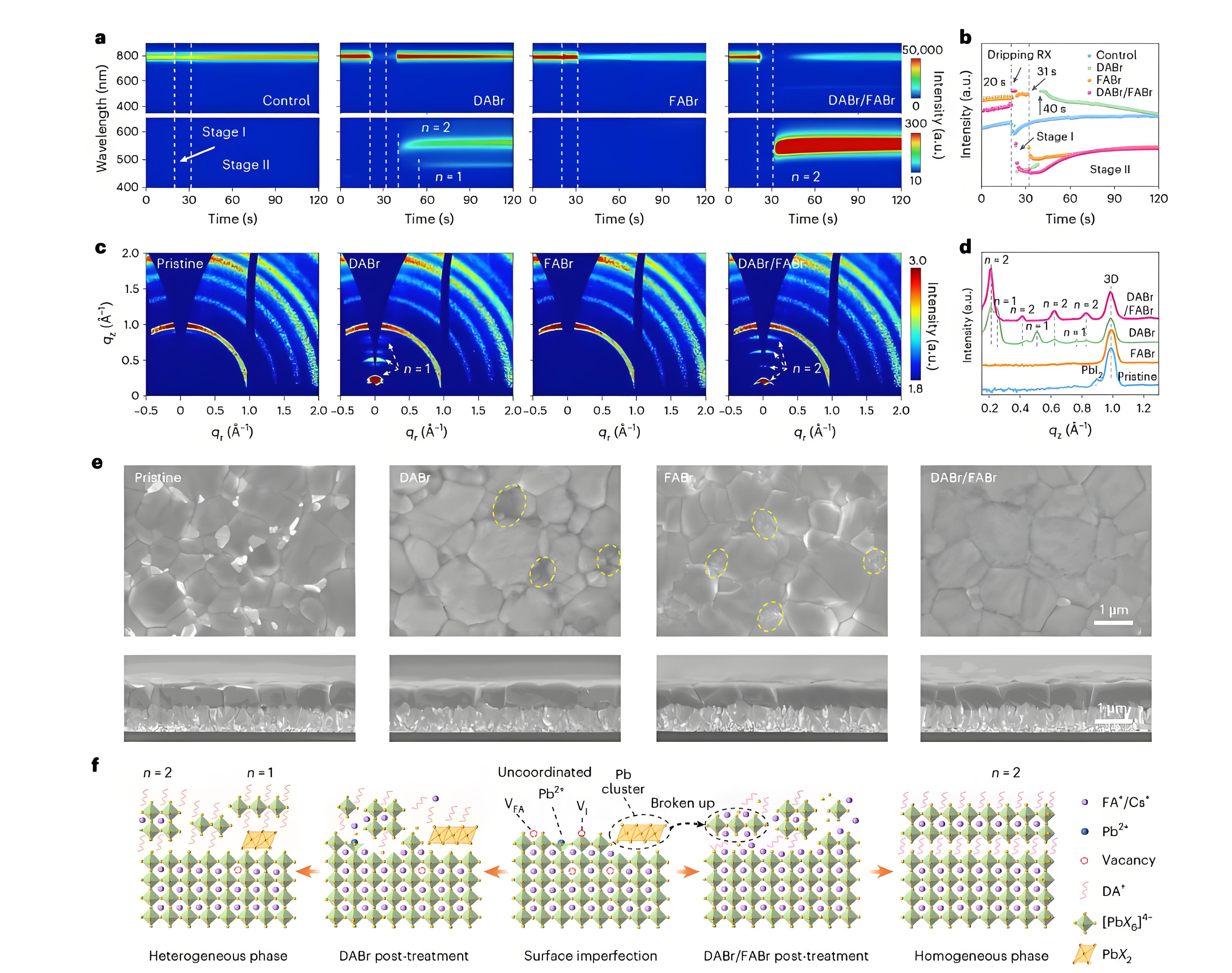 Fig. 2 | Growth kinetics and formation mechanism of the homogeneous 2D phase structure. a, In situ PL measurements of perovskite films with different organic salts post-treatment during spin coating. b, PL intensity evolution of the 3D perovskite phase derived from in situ PL measurements. The grey dashed lines and arrows with numbers highlight a turning point in the evolution of PL intensity. c, 2D GIWAXS data of perovskite films post-treated with different salts after annealing. d, 1D integrated intensity of 2D GIWAXS data along the out-of-plane scattering vectors, qz. e, The top-view and the cross-sectional SEM images of perovskite films post-treated with different organic slats. The yellow circles highlight distinct features of morphology. f, Schematic diagram of self-assembled different organic salts on the 3D perovskite surface producing different surface structures. V, vacancy.