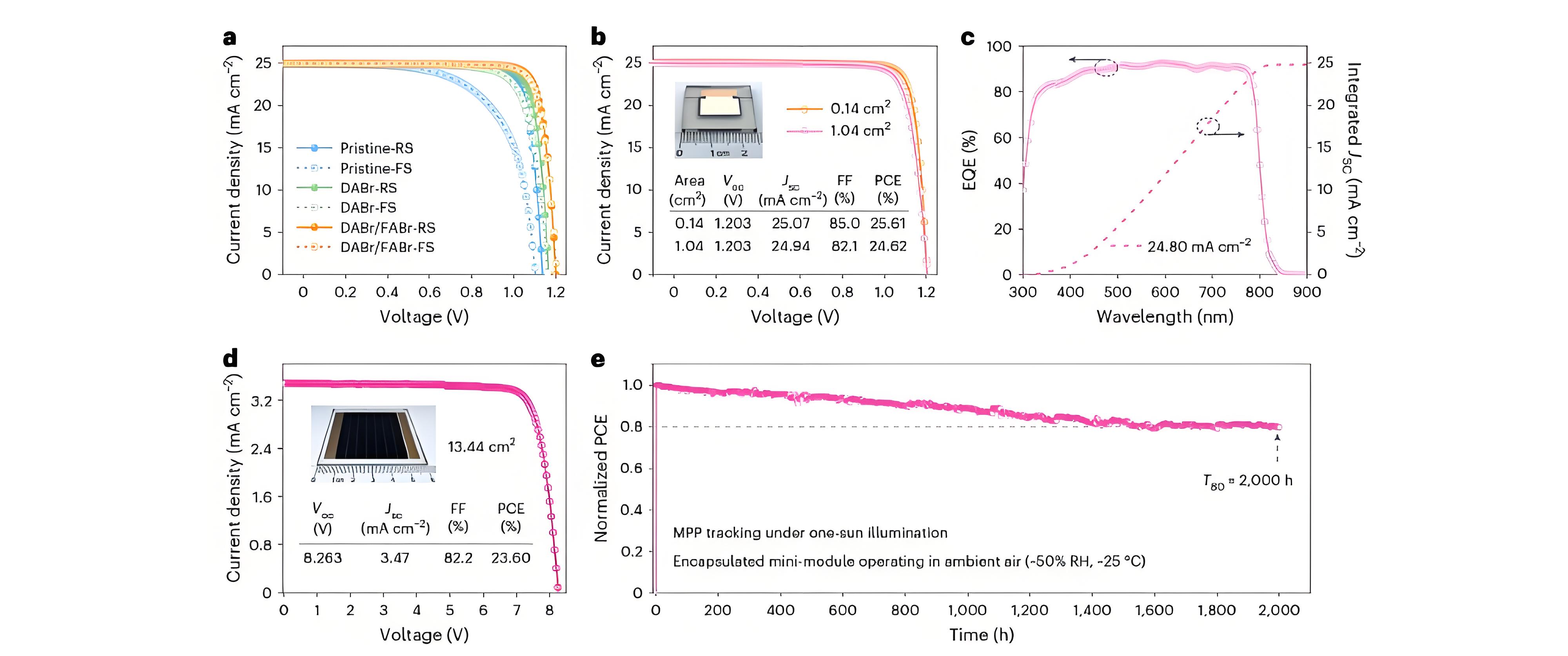 Fig. 4 | Photovoltaic performance and stability characterization. a, J–V curves of small-sized devices with the post-treatment of different organic salts. b, J–V curve of the champion devices with the post-treatment of DABr/FABr. Inset: the corresponding photograph of a 1.04-cm2 large-sized device. c, EQE curve of the large-sized device with the post-treatment of DABr/FABr. d, J–V curve of the champion mini-module with the post-treatment of DABr/FABr. Inset: the photograph of a mini-module. e, Continuous MPP tracking for the encapsulated mini-module in ambient air. FF, fill factor; FS, forward scan; RS, reverse scan.