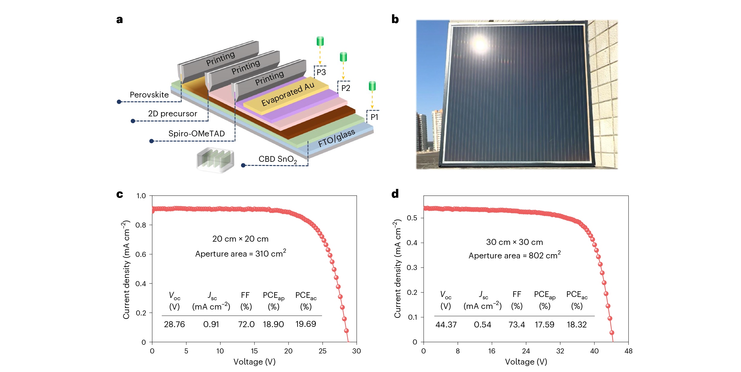 Fig. 5 | Scalable printed large-area modules. a, Schematic illustration for the scalable fabrication of large-sized PSMs with the corresponding laser processing (green cylinder) and the chemical bath deposition of large-scale SnO2 films (bottom inset). b, Photograph of a 30 cm × 30 cm PSM. c, J–V curve of the champion 20 cm × 20 cm sub-module with a series connection of 26 subcells. d, J–V curve of the champion 30 cm × 30 cm small module with a series connection of 42 subcells. PCEap, aperture-area efficiency; PCEac, active-area efficiency.