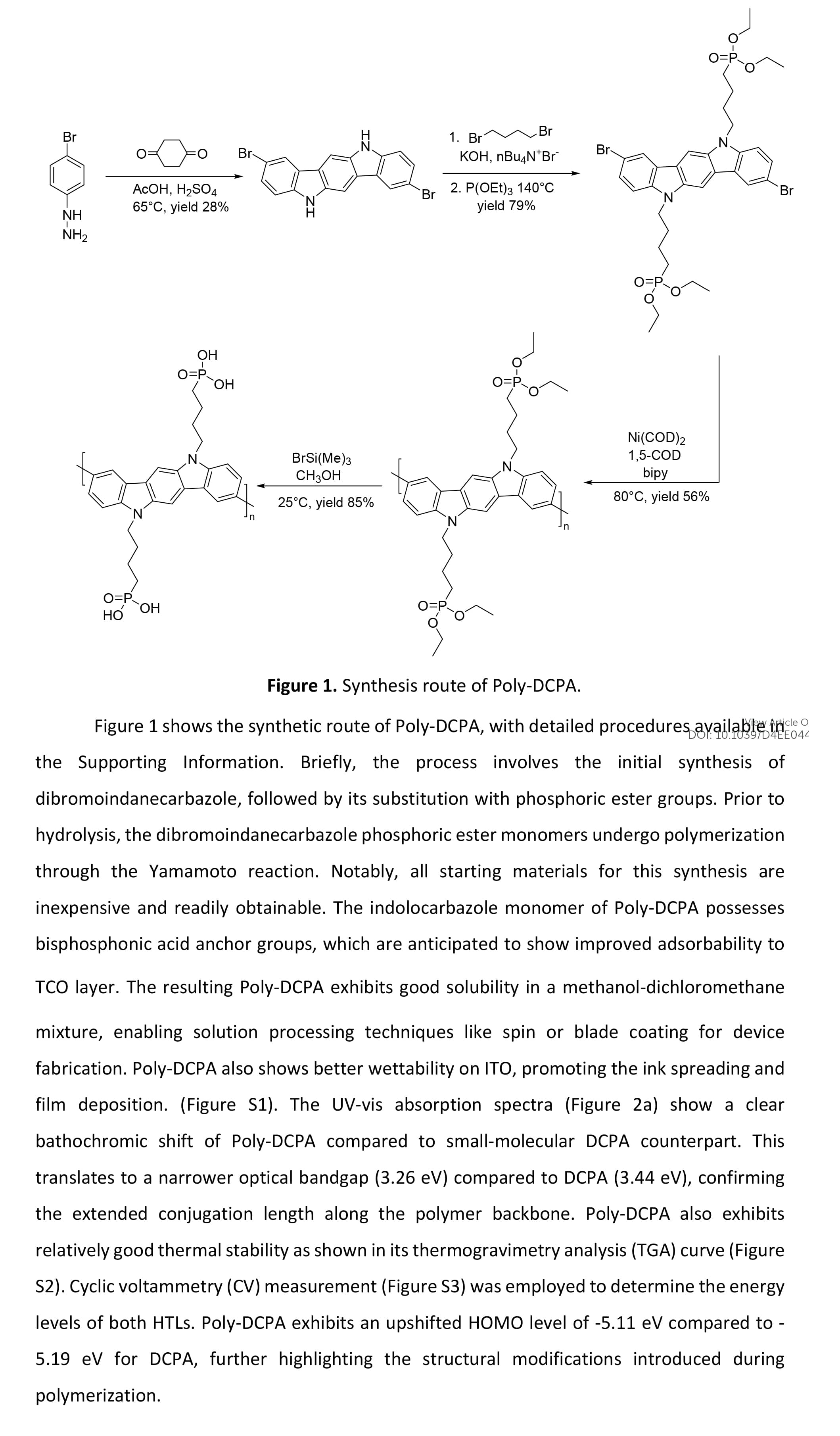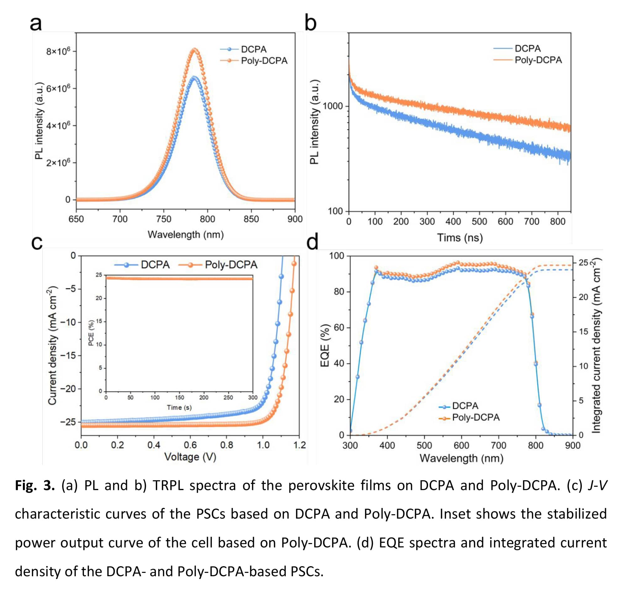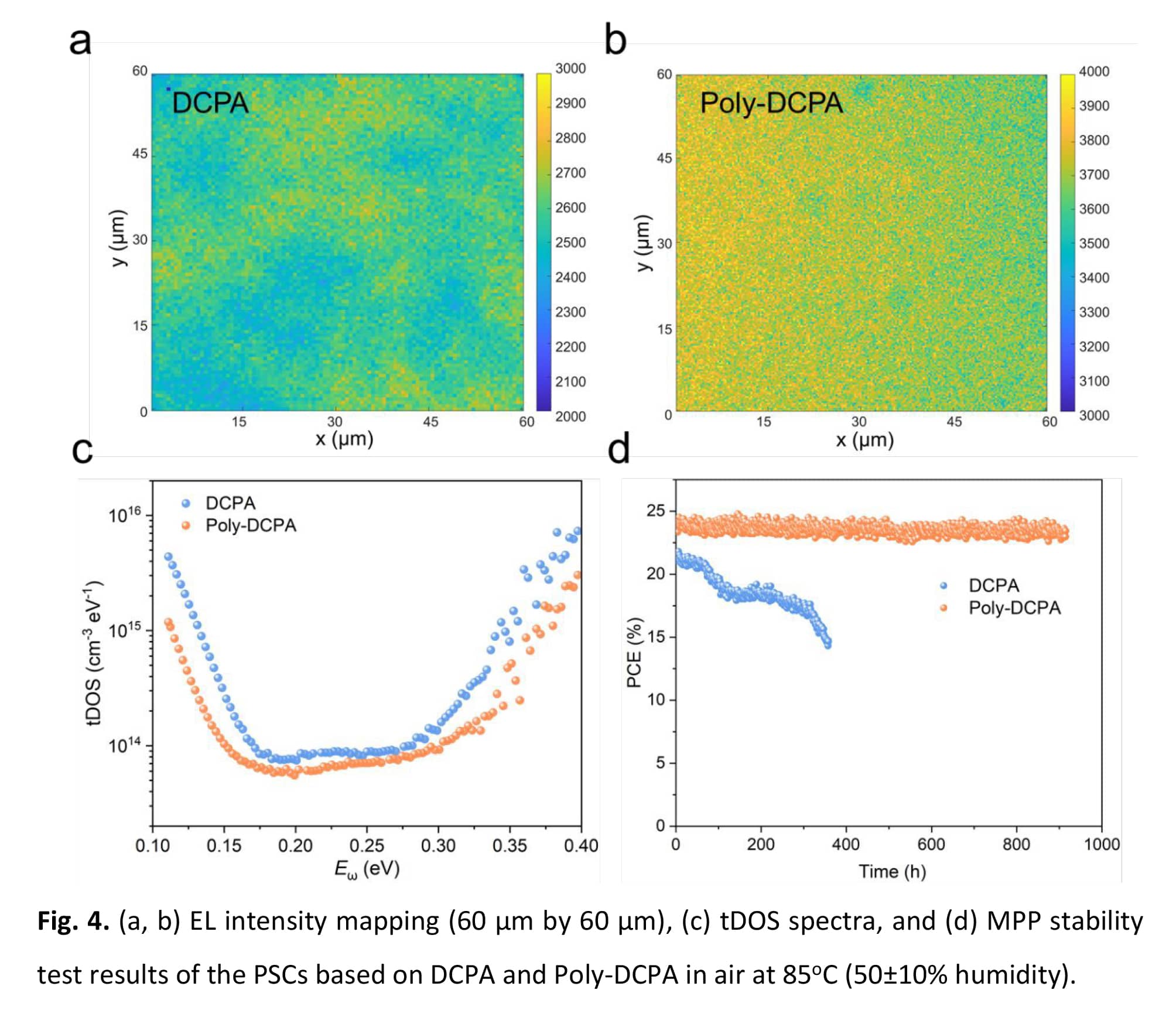 Key Highlights: This paper develops a novel polymeric hole transporter (Poly-DCPA) with enhanced properties. Compared to self-assembled monolayers (SAMs), its adhesion to TCOs is significantly improved. Poly-DCPA also exhibits excellent conductivity and uniformity, enabling blade-coated PSCs fabricated under ambient conditions to achieve a power conversion efficiency of 24.9%. Furthermore, the poly-DCPA-based perovskite solar cells exhibit excellent stability, retaining 94% of their initial efficiency after over 900 hours of light immersion at 85°C.