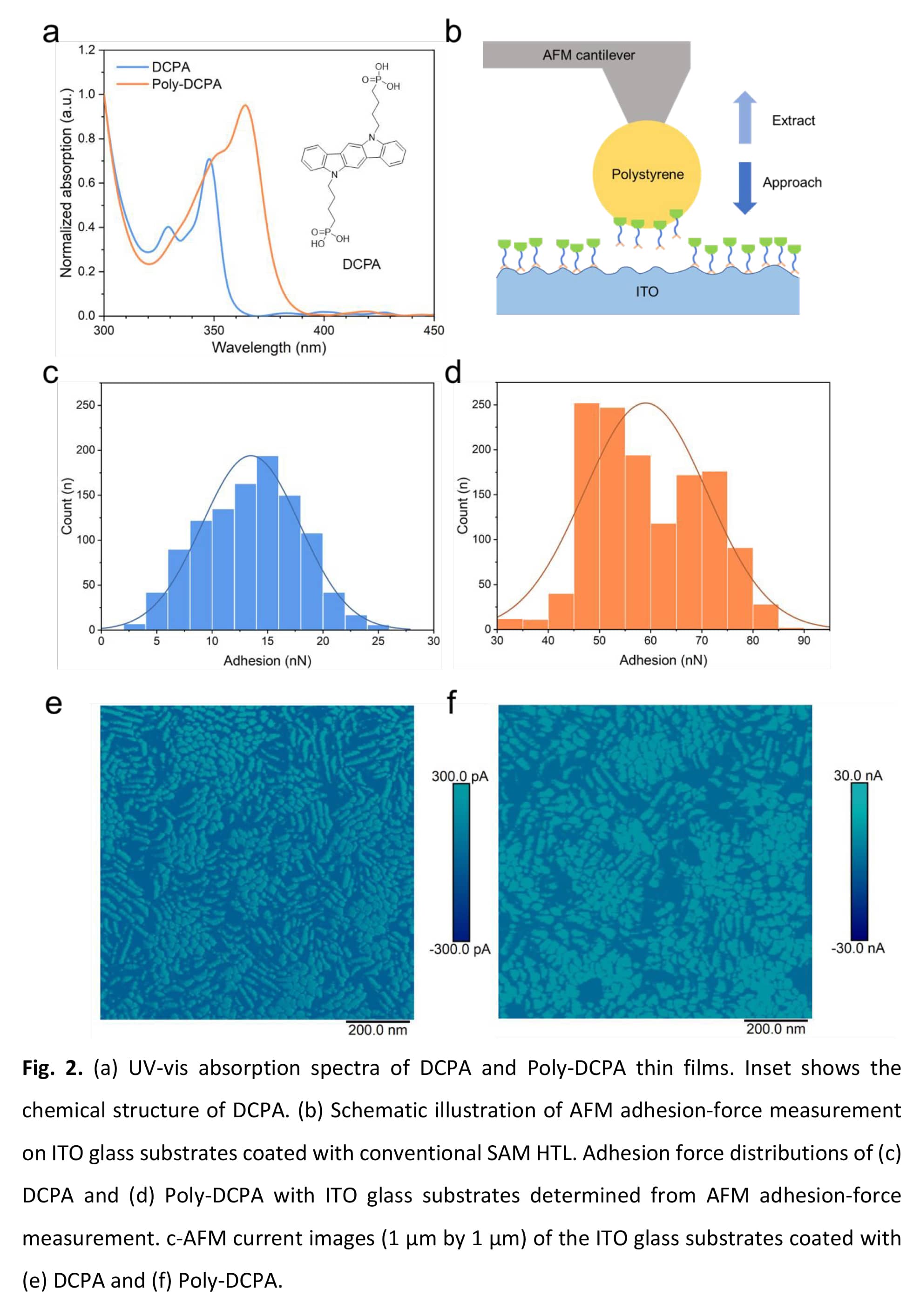 In light of this, Chen Shangshang's team at Nanjing University has demonstrated the ability to enhance interfacial adhesion through polymer hole transport materials, enabling high-performance air-processing perovskite solar cells. Through rational hole transport material design, interfacial adhesion can be significantly improved. They designed poly-DCPA, a novel polymer hole transport material that exhibits over fourfold enhanced adhesion compared to self-assembled monolayers (SAMs) of DCPA. Poly-DCPA also exhibits superior conductivity and improved uniformity, enabling blade-coated perovskite solar cells fabricated under ambient conditions to achieve a power conversion efficiency of 24.9%. This surpasses the performance of perovskite solar cells using DCPA SAMs as hole transport layers. Furthermore, the poly-DCPA-based perovskite solar cells exhibited excellent stability, retaining 94% of their initial efficiency after over 900 hours of light immersion at 85°C.