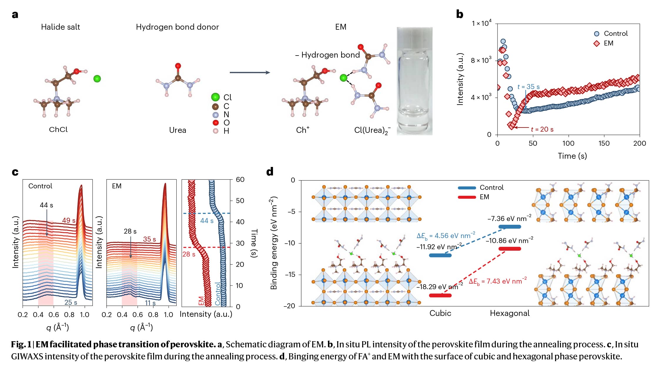 This study demonstrates a novel EM with hydrogen bonding that modifies the phase transition process, enabling highly efficient FA-rich tricationic perovskites. The perovskite film combined with EM exhibits a facilitated phase transition from hexagonal to cubic phase by enhancing the energetic advantage of corner-sharing [PbI6]4− octahedra and eliminating hexagonal impurities. The proposed technique reveals the microscopic mechanism of the eutectic additive-facilitated phase transition and provides insights into the exploration of eutectic additives with tunable compositional properties.