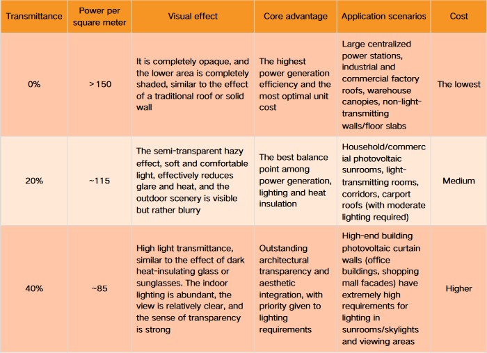 Note: Its power generation efficiency is the lowest of the three options, resulting in the highest unit cost. Choosing this option primarily addresses the core needs of high light transmittance and aesthetics.