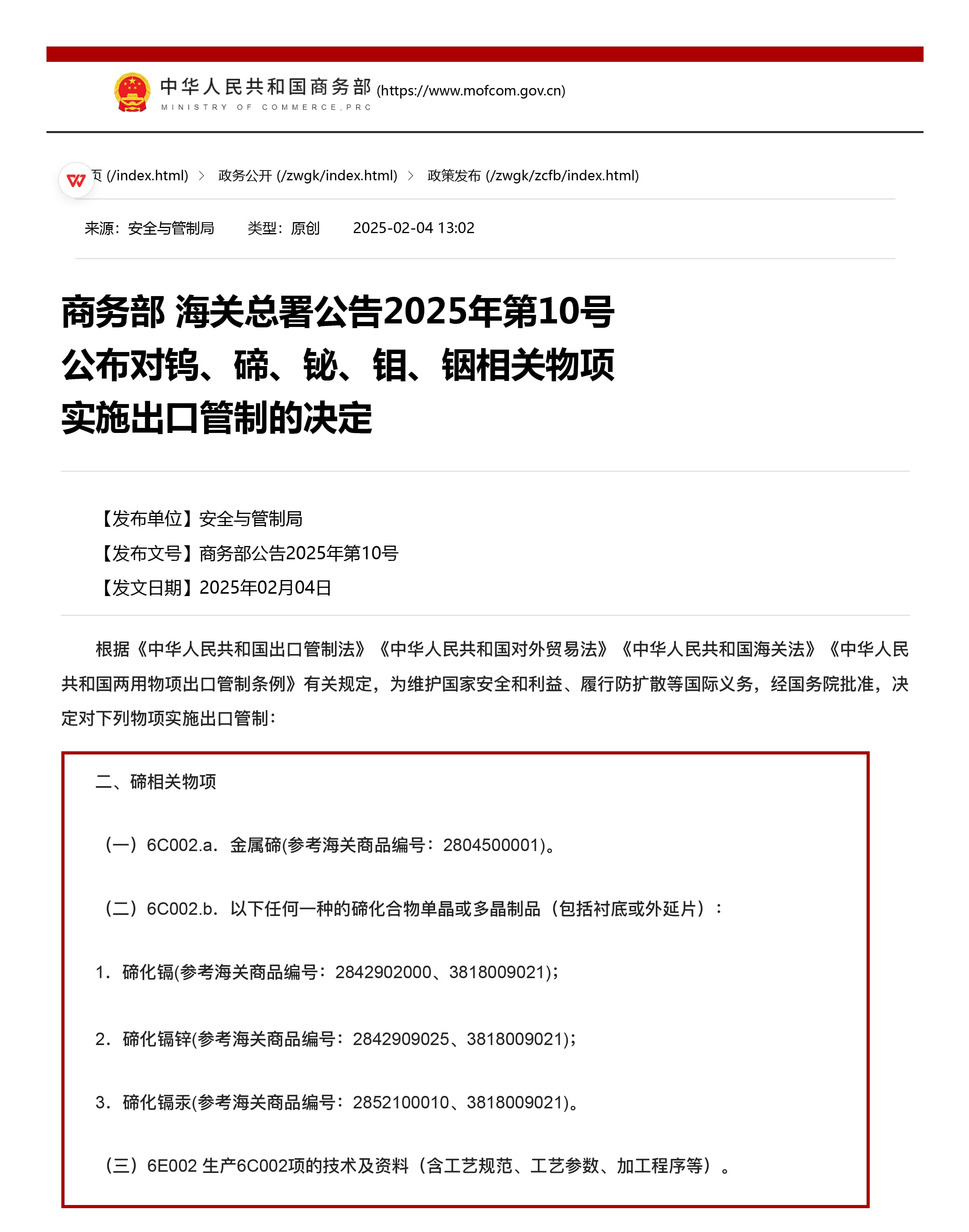 On February 4, the Ministry of Commerce and the General Administration of Customs jointly issued an announcement to formally implement export controls on tungsten, tellurium, bismuth, molybdenum, and indium-related items. This move aims to safeguard national security and interests and fulfill international obligations such as non-proliferation.