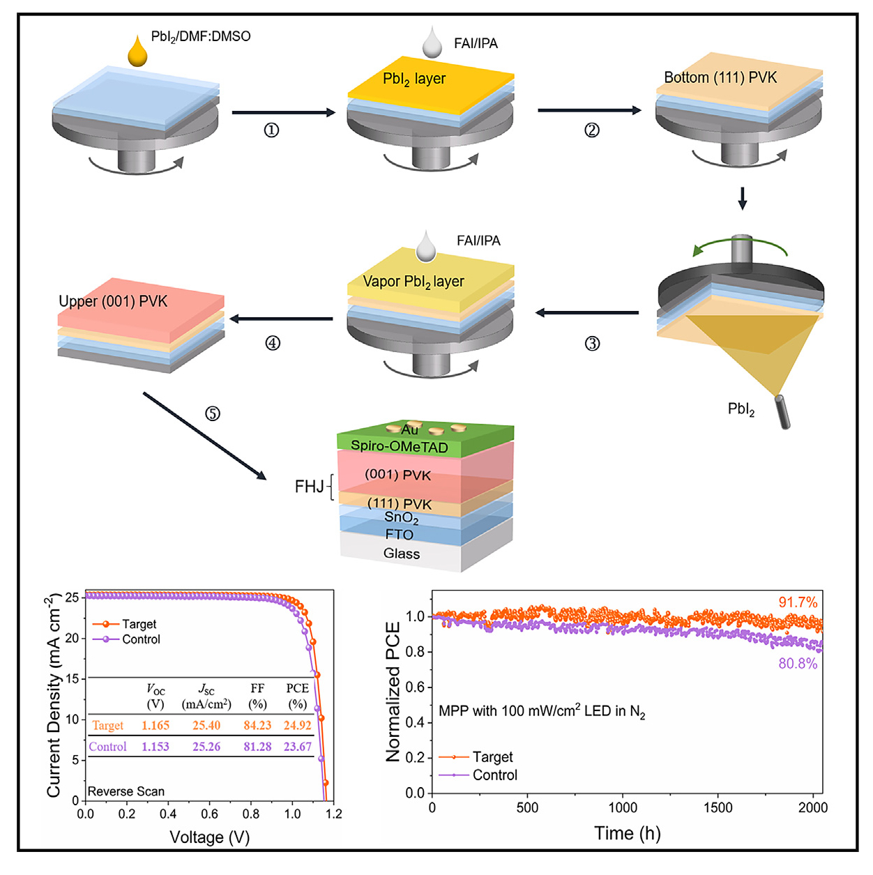 核心亮点:本文通过在基于钙钛矿光伏器件中,集成两种具有不同晶面(001)/(111)的薄膜,首次构建了面异质结,结合了钙钛矿的(001)和(111)面取向的优势,实现了蒸发法制备的钙钛矿太阳能电池的高效率(24.92%)和高运行稳定性(2000小时)。在最大功率输出下运行2000小时后,目标器件的初始性能保持了91.7%,显著提高了其运行稳定性。