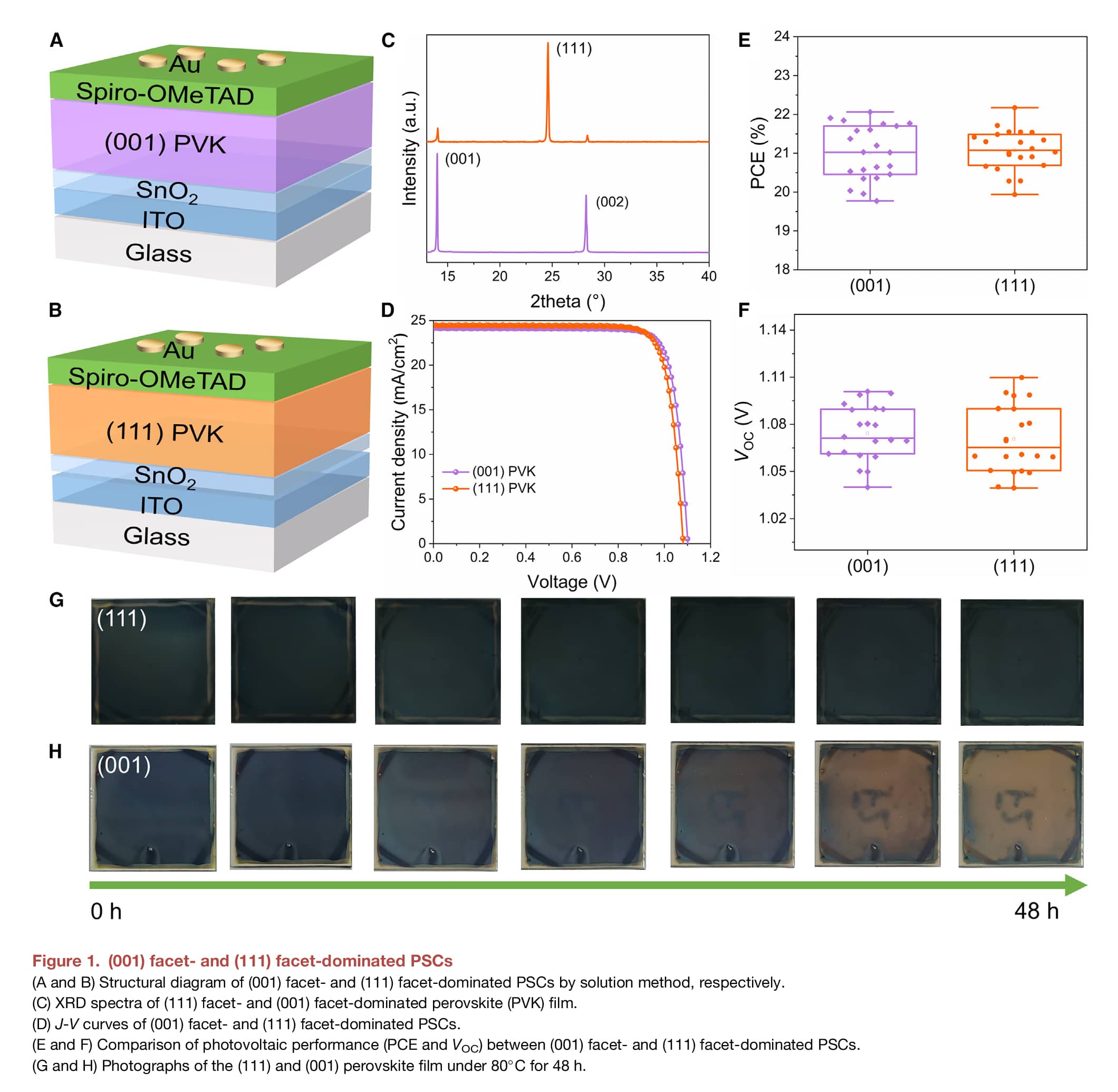 基于此,北京大学赵清&清华大学易陈谊研究团队通过整合两种表现出不同晶体面(001)/(111)的薄膜,在基于钙钛矿的光伏器件中构建了一种双层面异质结(FHJ)。该面异质结器件的掩埋界面表现出有效的II型能带排列,有利于光致载流子的分离和提取,从而减少载流子复合损失。面异质结将蒸发法制备的钙钛矿太阳能电池(PSCs)的功率转换效率(PCE)提升至24.92%。在最大功率输出下运行2000小时后,目标器件的初始性能保持了91.7%,显著提高了其运行稳定性。此外,FHJ器件实现了改进的操作稳定性和抗湿度和光热降解。