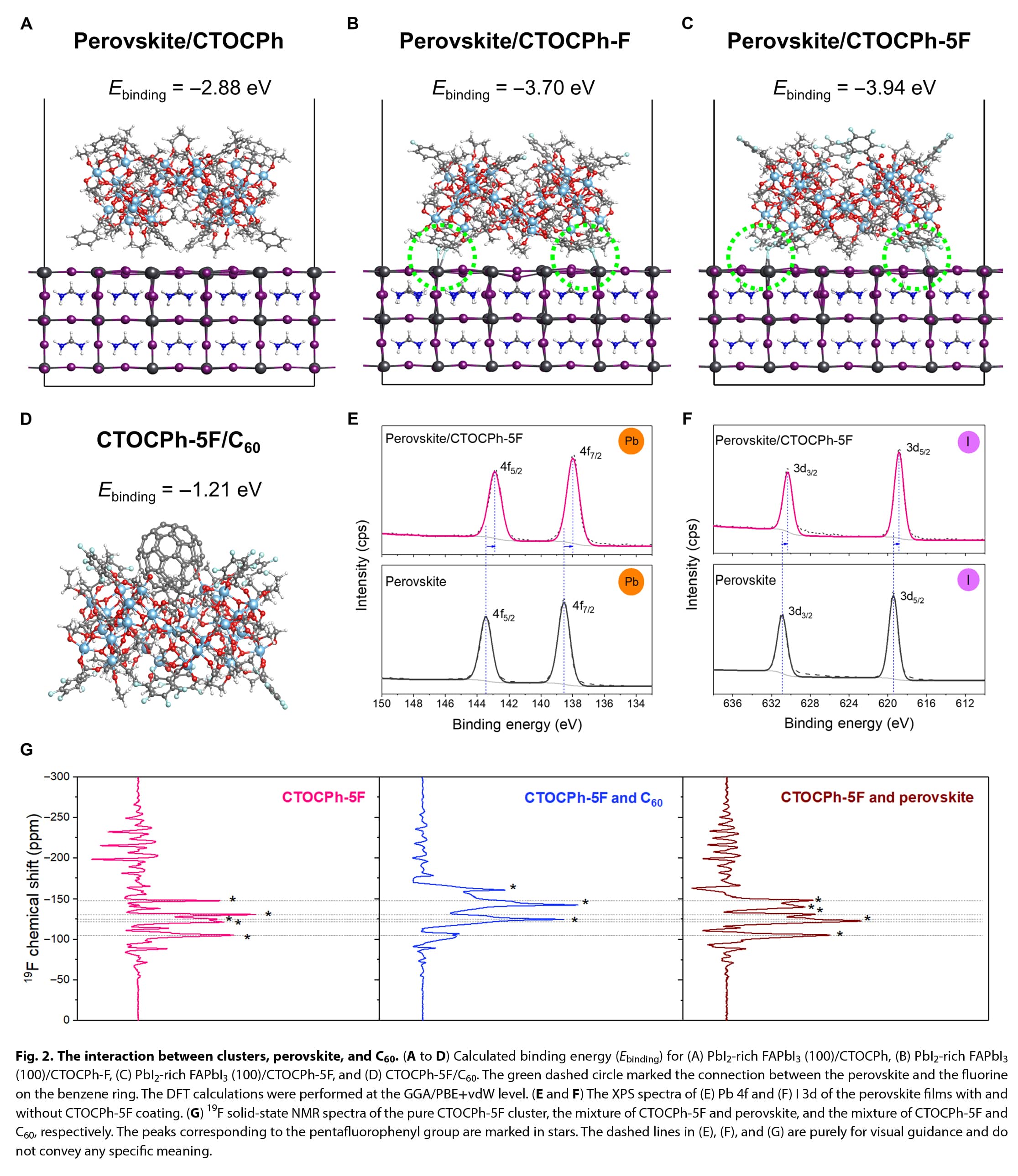 该研究提出了一种界面桥接策略,通过结合具有不同氟取代的分子可定制簇,同时增强与C60和钙钛矿的相互作用。团簇良好的分子内平面性和良好的溶解度使得形成致密均匀的盖层而不聚集。解决了与钙钛矿/ETL界面相关的持续重组损失和器件退化的挑战。为进一步开发先进的界面材料铺平了道路,以提高钙钛矿光伏电池的性能和耐久性。