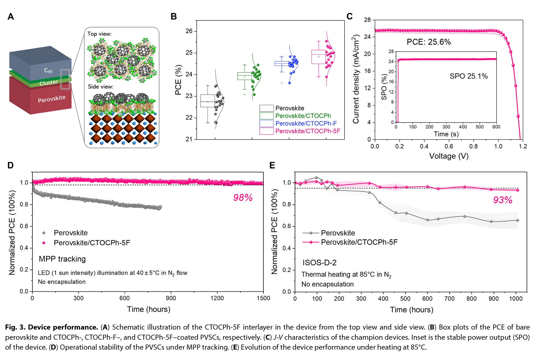 核心亮点:本文设计了一系列分子可定制的簇作为中间层,可以同时增强与C60和钙钛矿的相互作用,目标倒置PVSCs无需额外的表面钝化,即可实现25.6%的功率转换效率(PCE)。值得注意的是,未封装的器件在光、热和偏压下都表现出出色的稳定性,在最大功率点(MPP)跟踪1500小时后,其初始PCE保持在98%,在85°C加热1000小时后保持93%。