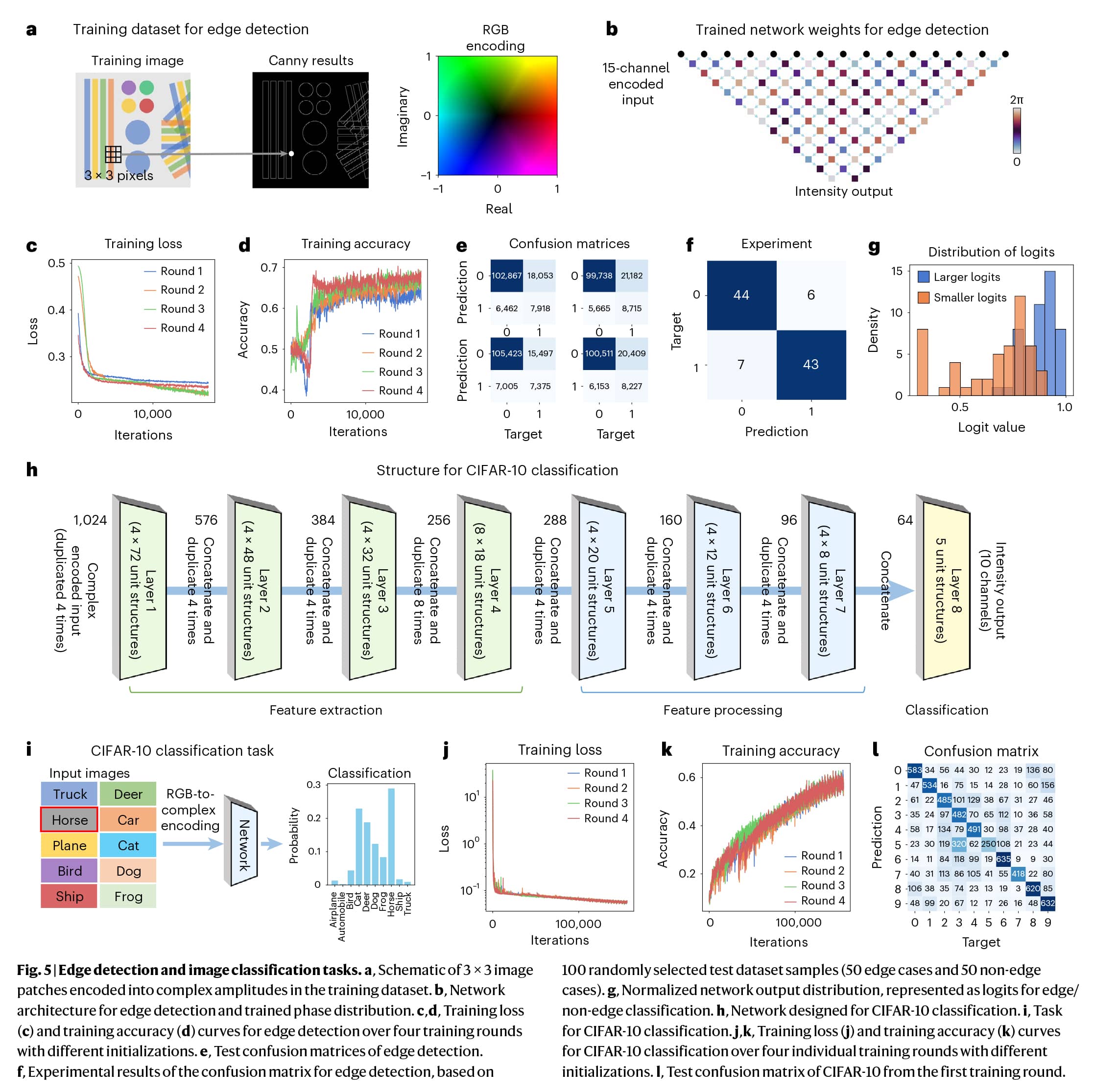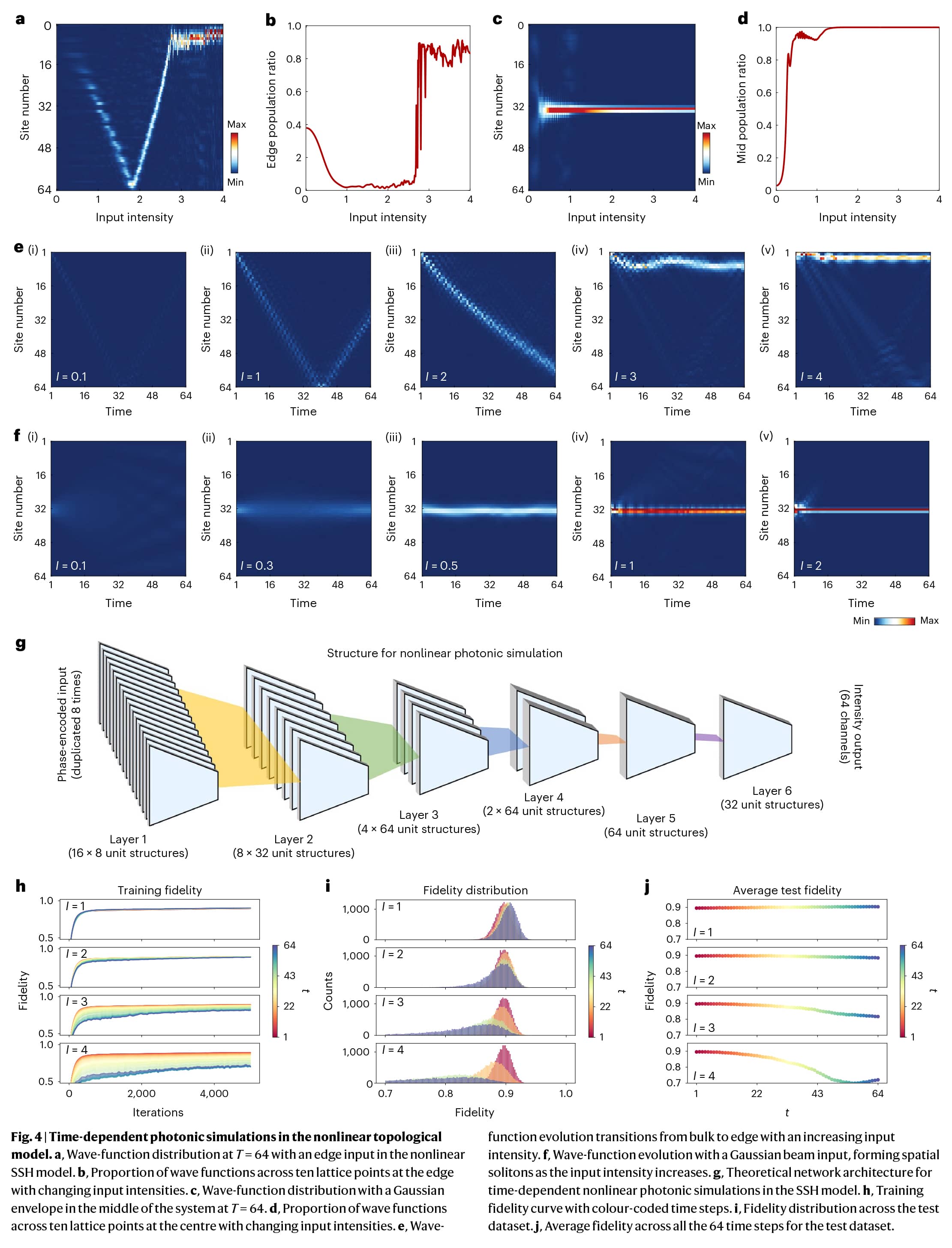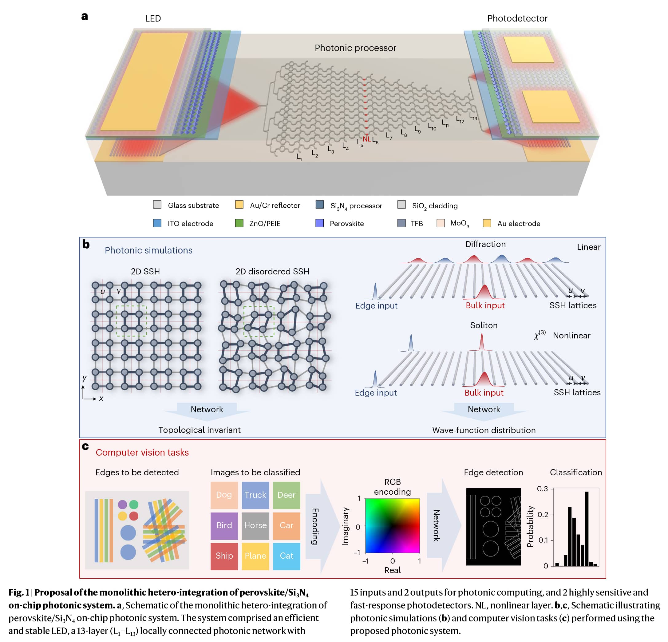 核心亮点:本文报告了一种基于非均匀集成金属卤化物钙钛矿/氮化硅(Si3N4)光子平台的片上光子系统,展示了其多功能性。该网络可以有效预测二维无序Su-Schrieffer-Heeger模型中的拓扑不变量,并以平均87%的保真度模拟非线性拓扑模型。此外,使用扩展架构在边缘检测中实现了超过85%的测试准确率,在CIFAR-10数据集上实现了56%的测试准确率。