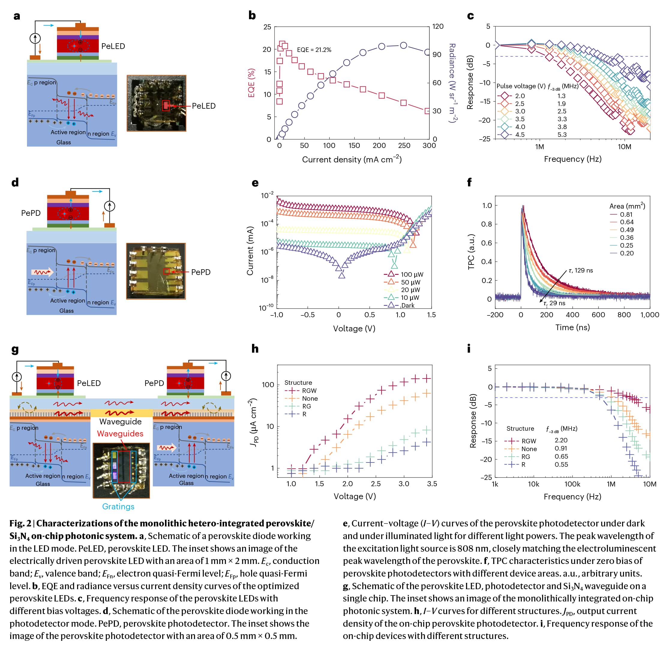 集成光子芯片在光通信、计算、光检测和测距、传感和成像方面具有巨大潜力,可提供出色的数据吞吐量和低功耗。一个关键目标是构建一个单片片上光子系统,将光源、处理器和光电探测器集成在一个芯片上。然而,由于材料工程、芯片集成技术和设计方法的限制,这仍然具有挑战性。钙钛矿具有简单的制造、对晶格失配的耐受性、灵活的带隙可调性和低成本,使其有望与硅光子进行异质集成。