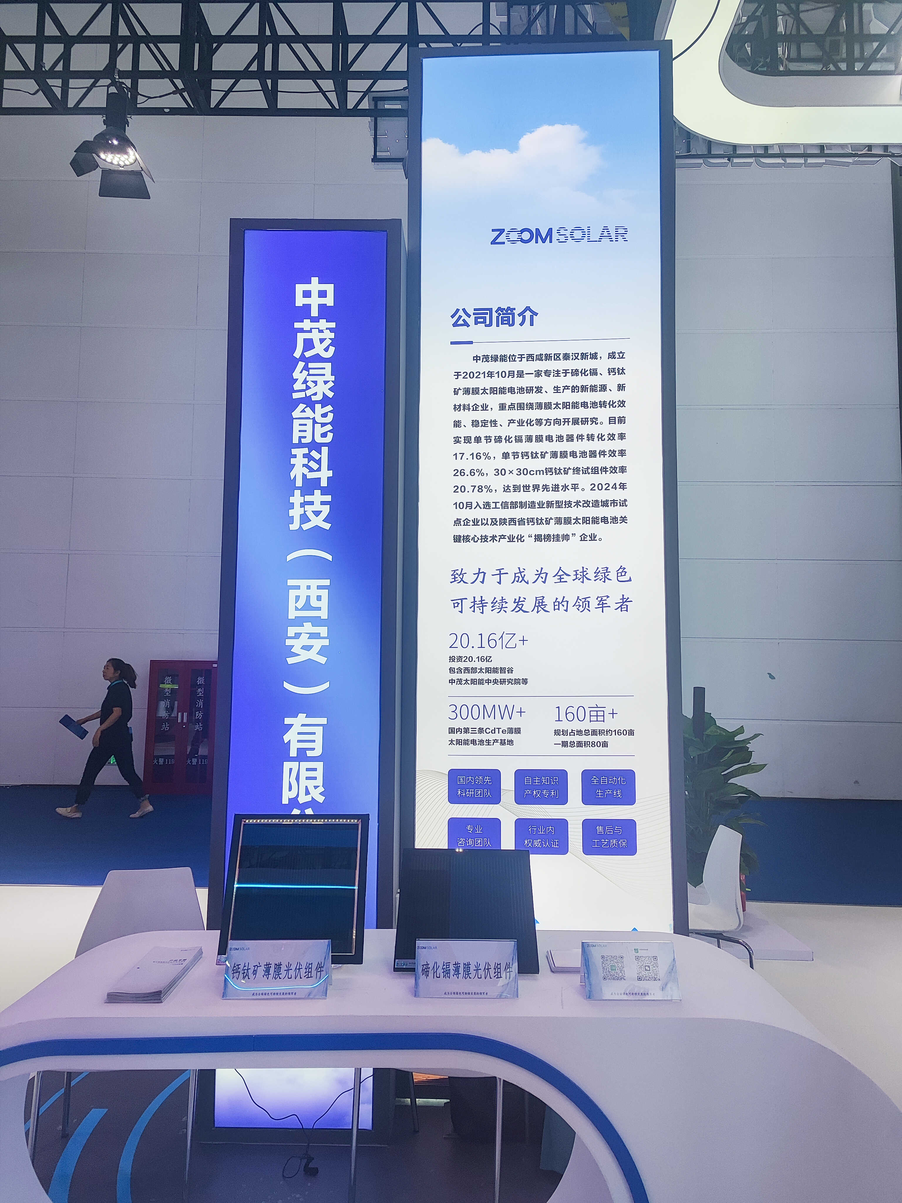由陕西省工业和信息化厅主办的“专精特新展”区位于4号馆,占地面积500㎡。重点展示秦创原创新驱动平台成果、科技成果转化项目及专精特新企业技术突破。作为高新技术企业代表,中茂绿能科技携碲化镉(CdTe)、钙钛矿薄膜光伏组件两大创新成果亮相“科技创新展”,以创新技术诠释“新质生产力”,助力“双碳”目标实现。