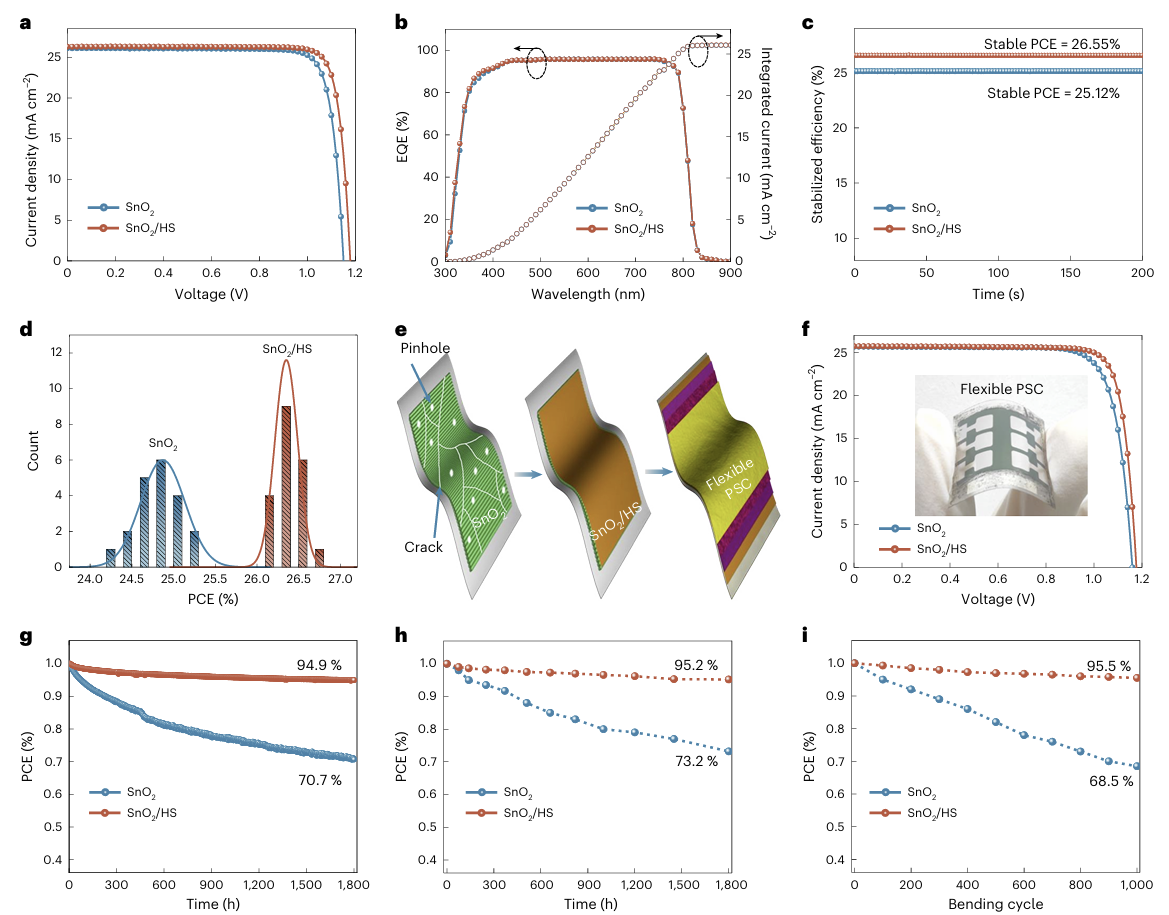 针对该问题,中国科学院大学、阿卜杜拉国王科技大学以及海南大学科研团队合作引入线性聚合物肝素钠(HS),并将其作为n-i-p型钙钛矿太阳能电池的多功能界面桥连层。区别于常用的小分子界面修饰材料,HS主链上下两侧密集分布着羧酸根(COO⁻)、磺酸根(SO₃⁻)与钠离子(Na⁺)等功能基团。该材料通过化学键桥连SnO₂电子传输层与钙钛矿薄膜,显著降低界面缺陷密度,同时强化异质界面结合。基于此制备的刚性器件实现了26.61%的能量转换效率(认证效率26.54%);而柔性SnO₂/HS器件亦达25.23%的PCE。在稳定性方面:HS器件在模拟标准太阳光下持续运行1,800小时后仍保持94.9%初始效率;经85℃高温老化1,800小时后,效率维持率达95.2%,展现卓越的工作稳定性与热稳定性。