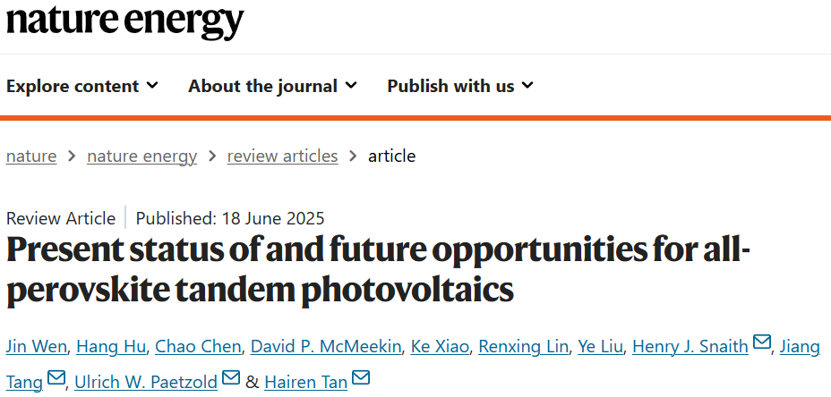 南京大学谭海仁团队在Nature Energy期刊发表“Present status of and future opportunities for all-perovskite tandem photovoltaics”的研究论文,Jin Wen为论文第一作者,南京大学谭海仁、卡尔斯鲁厄理工学院Ulrich W. Paetzold、华中科技大学唐江、牛津大学Henry J. Snaith为论文共同通讯作者。