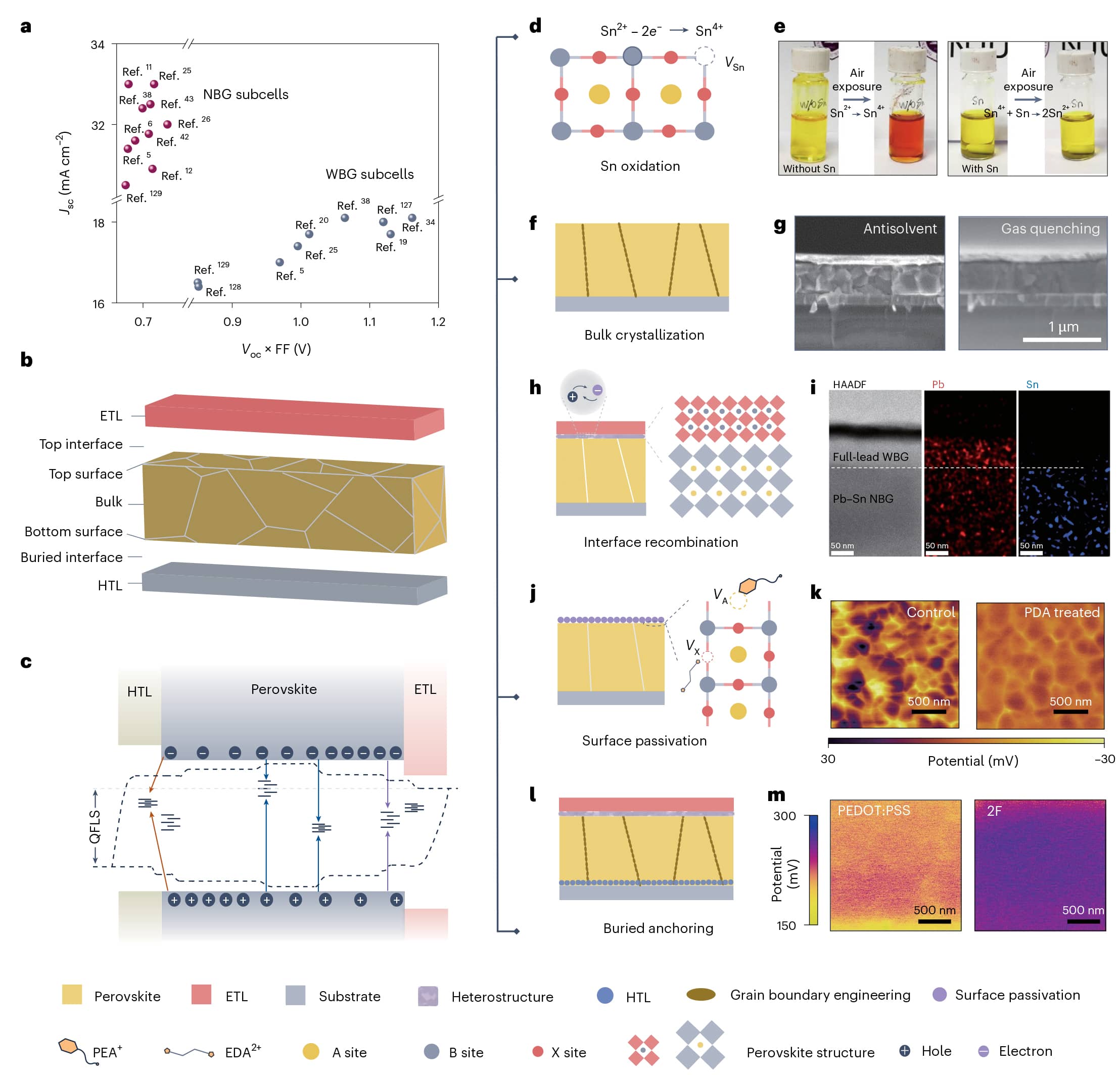 核心亮点:本文总结了全钙钛矿叠层电池在效率提升、稳定性优化及规模化制备三大方向的突破性进展。提出通过界面工程、缺陷调控和隧道复合结(TRJ)优化等策略,解决了叠层器件中宽带隙(WBG)与窄带隙(NBG)子电池的电流匹配、非辐射复合及长期稳定性难题。