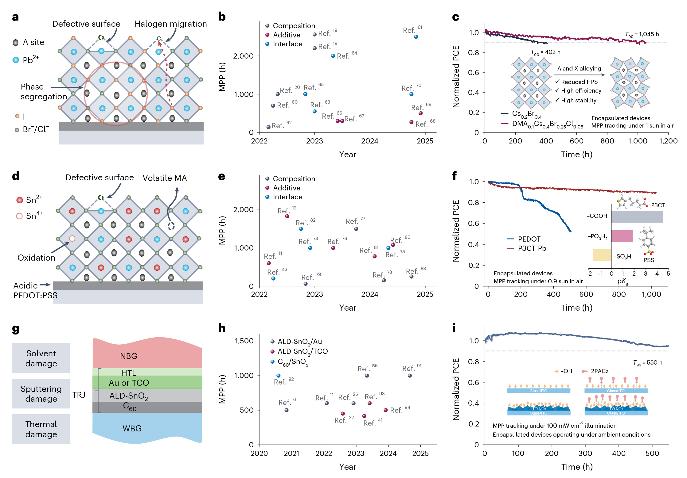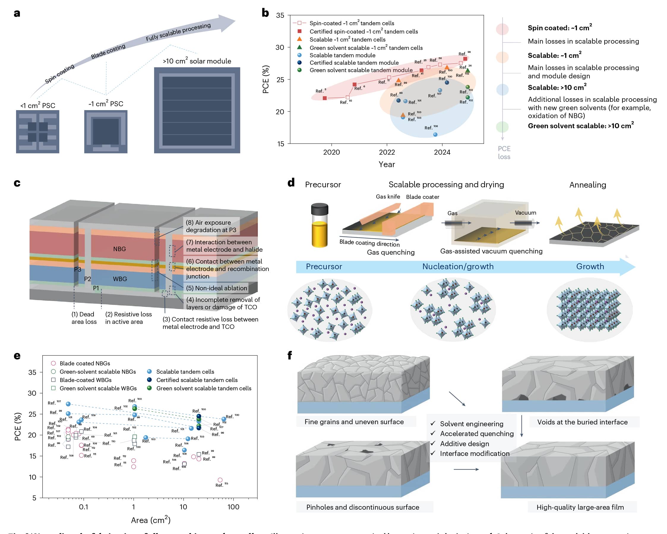 全钙钛矿叠层太阳能电池代表了下一代光伏技术的前沿,为超越单结太阳能电池的肖克利-奎瑟效率极限,同时保持了成本效益和可扩展性,提供了一条充满希望的途径。但从实验室规模的原型到商业化产品的过渡面临着诸多挑战。大面积制造要求开发可扩展的制造技术,同时与实验室规模的旋涂工艺相比,最大限度地减少性能损失。此外,实现长期稳定性、可靠性、从电池到模块的高效集成以及实际部署期间的高良率仍然是关键挑战。