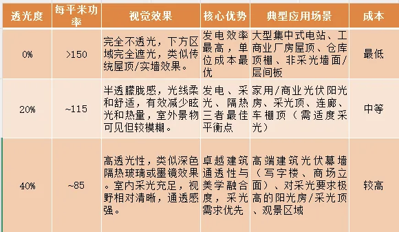 注意点:发电效率在三者中最低,单位发电成本相对最高。选择它主要是为了满足高透光与美观的核心诉求。