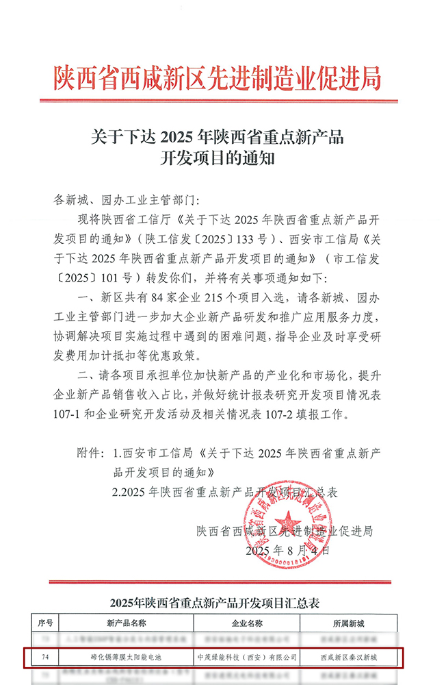 近日,陕西省西咸新区先进制造业促进局正式发布了《关于下达2025年陕西省重点新产品开发项目的通知》,中茂绿能科技(西安)有限公司自主研发的“碲化镉薄膜太阳能电池”成功入选陕西省重点新产品开发项目,成为区域内重点支持的创新企业之一。这一荣誉不仅是对公司技术实力的高度认可,更是对我们在新能源领域持续创新的激励。