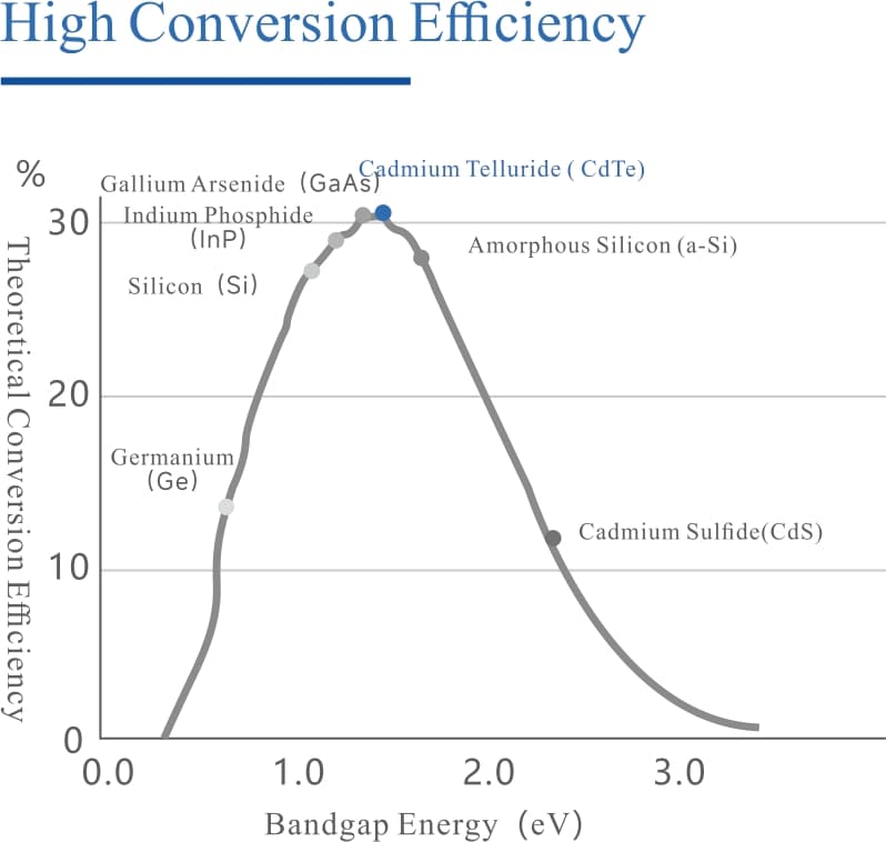 Cadmium telluride is not picky about light angles. Whether on cloudy days, during dawn or dusk, or in complex environments with diffuse light reflection, it efficiently captures photons. This gives cadmium telluride a 10%-15% advantage in low-light response performance over traditional photovoltaics, resulting in 8%-17% higher power generation than crystalline silicon products under the same installed capacity.